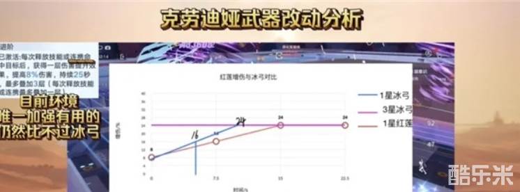 从改动上来说,红莲对目前武器搭配的适用性上,仅仅是提升了叠满的速度,但是提升的速度也并没有快多少,最快也需要15秒才能叠满,期间要浪费一次连携的机会,冰弓与之对比就如图所示:而冰弓就算1星三次闪避就能叠满,1个闪避回复只需要3秒,叠满也只需要3个闪避9秒时间。3星的冰弓更是只要近身就能一次叠满buff。