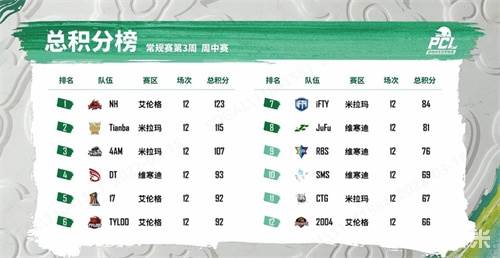 临近常规赛尾声,同时加上战队的磨合度愈发的提高,各支战队已不再有所保留,全力冲击积分榜。在本周周中赛中,4AM战队稳住架势,挨个击破对手,尤其xxxLu选手首日以1785的伤害和37%的得分贡献率帮助队伍锁住积分榜第三的位置,最终队伍以107总积分,保住第三拿到周决赛的入场券;Tianba战队拿下首日首局的首鸡,以势不可挡的姿态在周中赛首日登顶,最终以115总分位居周中赛第二,晋级周决赛;卫冕周冠的NH战队在本周周中赛中再次体现其强大的统治力,ZpYan1选手和HSmm选手分别以21个淘汰数、34%的得分贡献率和12个淘汰数、23%的得分贡献率,让队伍以123的总分高居周中赛榜首,头名晋级周决赛!除此之外DT战队、17战队、TYLOO战队等传统豪强也都悉数晋级。