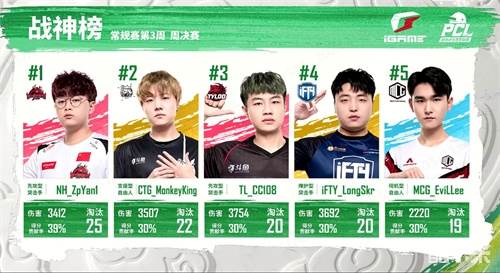 本周周决赛中,没有卫冕三冠的NH战队依然存在感十足,队内ZpYan1选手以高达2.9的KDA,3412的伤害拿下25个淘汰以及39%的得分贡献率荣获战神榜榜首。CTG战队的MonkeyKing选手赛中一次奇迹一穿三证明其手感火热,本周周决赛战神榜中更是以3507的伤害和22个淘汰数坐稳第二名,以30%的得分贡献率帮助队伍获得冠军。TYLOO战队的CC108选手则是以3754的伤害和20个淘汰数位居第三。周季军iFTY战队的LongSkr选手更是凭个人累计淘汰突破900人PCL联赛历史击杀榜第一位。(历史第一),并以3692的伤害和20个淘汰数排名第四。此外,MCG战队的EviLLee选手以2220的伤害和30%的得分贡献率同样榜上有名。