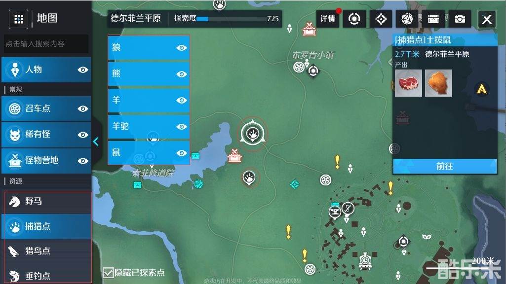 如果你所有地图传送点都解锁后,地图上可以找到对应地图的捕猎点、猎鸟点、垂钓点等基础的资源点。每个地图上的资源不一样,通过滑动地图即可找到不同的资源。