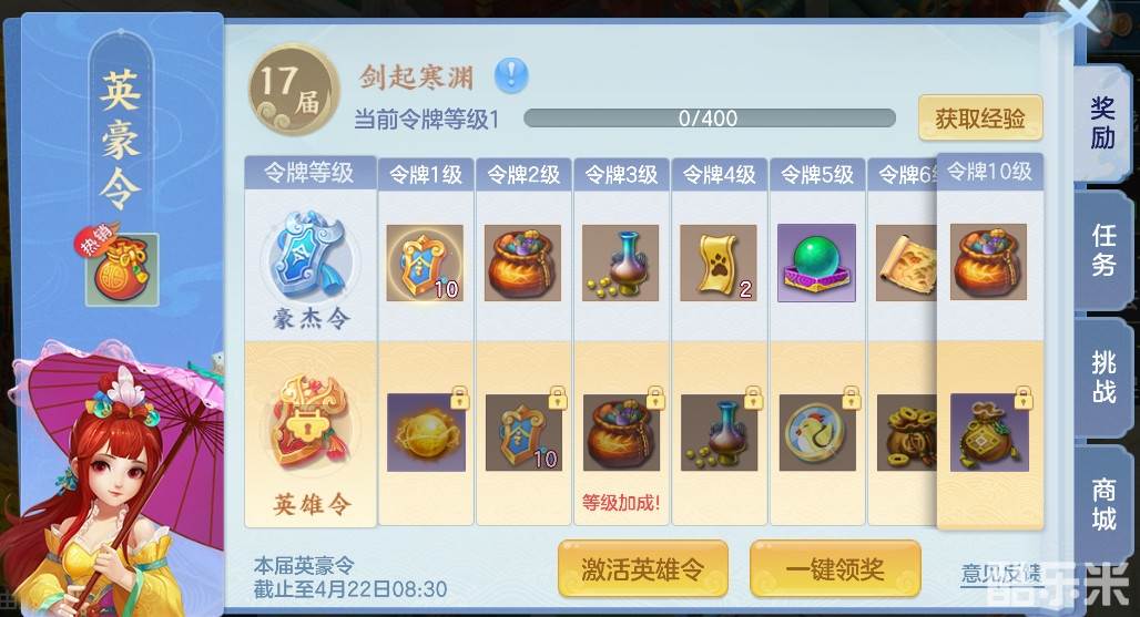 古道雄关,剑起寒渊,英豪令第17赛季正式开启,赛季主题为剑起寒渊,本赛季将持续至2022年4月22日8:30。循着先遣队拓本留下的线索,众人终于发现了寒渊城。但偌大的城池中杳无人烟,更有含有水火之力的混沌魔物在外徘徊。在日常战斗中战胜寒渊城的妖物可获得手札残页,上交可以增加全服英豪令战斗解锁进度并获得奖励,当上交进度积累到一定程度,便可奉旨挑战五处混沌魔物,将它们赶出寒渊城,挑战成功可以获得太史局颁发的奖励。