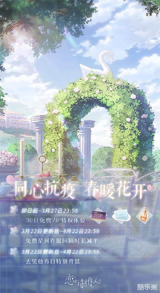 3月18日起至3月27日,登录游戏即可在邮箱领取【特权体验卡*30、口罩*30、洗手液*30】的市政速运补给。制作人出门还请一定记得勤洗手、戴好口罩哦。3月22日更新后~4月22日,许愿树免费星河许愿间隔时长减半;此外,前往【去见他】还可免费解锁通用背景【春暖花开】。愿疫情早日好转,再度沐浴明媚春光。