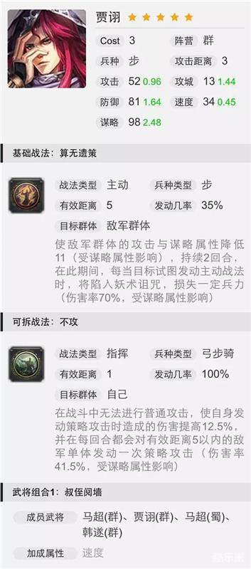 三围来说,0.96的【攻击】,普攻伤害不算高。1.64的【防御】在谋略将中算是相当高的,当中军甚至前锋也不会显得脆弱。2.48的【谋略成长】也很出色,配合全谋加点只要是【谋略】相关的技能带上的效果都挺好。3的【攻击距离】也很灵活,不过0.45的【速度】作为一个输出将来说较慢,这也一定程度决定了贾诩队伍喜欢打后期。