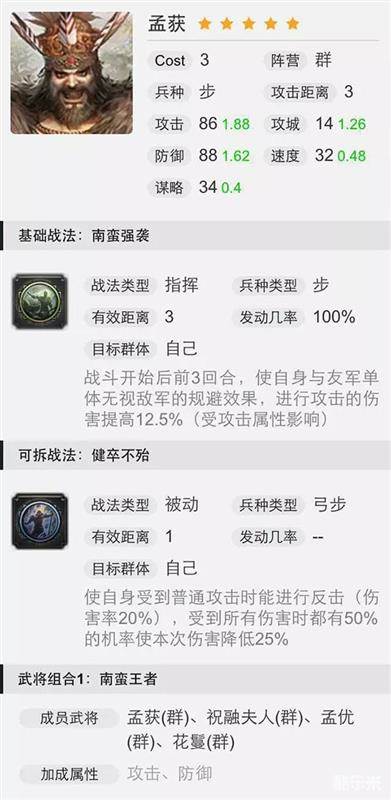 接下来说搭配,首先定位上,攻击不算太高却又稳定能给自身加成,攻击距离也够。所以孟获作为中军补足输出是最好的,作大营和前锋则并不理想——大营输出不够,前锋容易兵力折损过快浪费自身加成。而队友方面,由于技能只加成攻击伤害,而群步全是法系伤害。并且,有一个简单而直接的问题:如果我要这个技能的话,我为什么不直接带一个大赏三军?所以孟获明明有着不算特别差的三围,有着还可以的技能,实际却少有发挥。