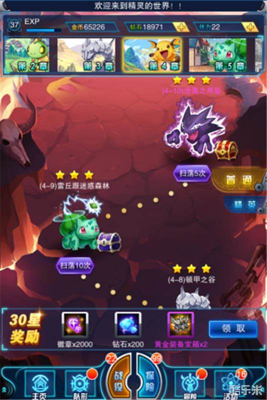 (2)点击大章图标进入小节关卡,点击关卡上的精灵即可进入战斗。