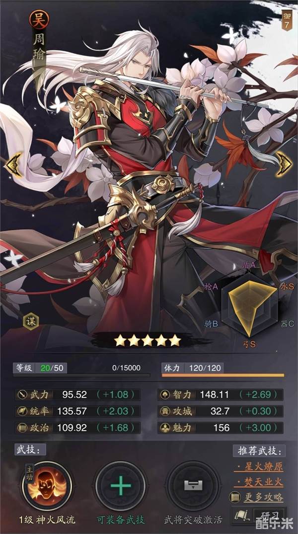 周瑜在《神将三国》中武将定位较为全面,可以作为谋略输出,也可以作为辅助和控制。初始高智力和统御值以及较好的三围成长,让其相较于其他谋士而言更具有作为主将的潜质,输出较高,配合其他火攻技能也可以打出强力的控制和爆发。