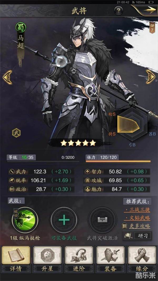 总结:三战三捷是最适合马超的技能,三战之后,三捷可以直接触;提供法伤、守御、治疗,文韬武略叠加满后可以提供75武力跟智力,加强马超的武力伤害和三捷的伤害、回复;赵云八门提高马超攻速,更快的打出控制效果,威风凛凛提供犹豫效果;关羽带断腕提供破甲效果,横扫提高输出上限。