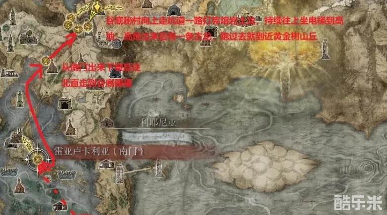 此路线优势:大概10分钟完成从初始引导到黄金树山丘,全程只有一个boss战是古遗迹断崖的熔岩土龙。最后只要再跑到王城北门打龙装大树守卫之后就可以进王城了。