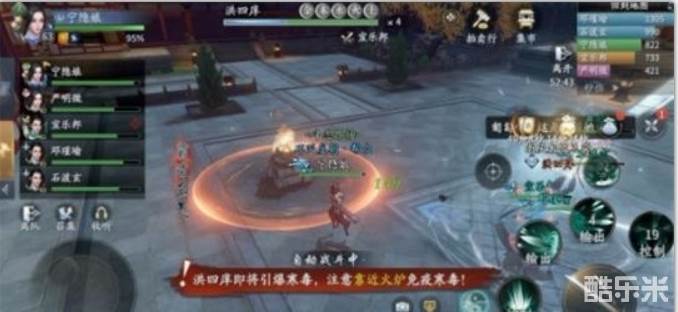 洪四庠的二技能【霸道真气】在施放后,会在2秒左右的时间引爆寒毒。这个技能就霸道在全地图伤害,如果身上叠了寒毒DEBUFF,会受到更高额的伤害。届时我们需要看四周的火炉,哪一个亮起来,就靠近那一个火炉。不仅可以免疫巨额伤害,还可以将之前的DEBUFF消除。注意机制站圈躲圈,洪四庠并不难。