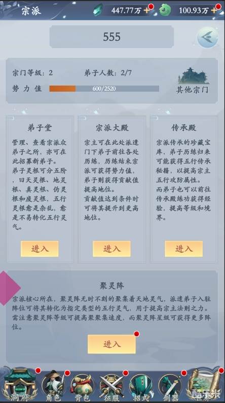 但创建后不可删除退出,在宗门内通过培养弟子和派遣弟子收集灵气提升玩家战力和获得额外物资;宗派允许迁移城市,但每次都需要花费仙玉。
