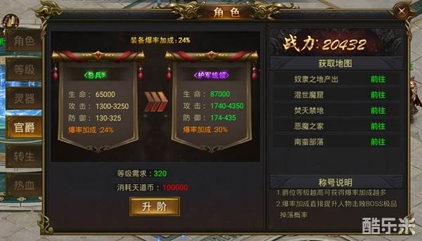 勇士们通过新手阶段后不久就能见到官爵系统了,平时点击头像或者“人物”图标就可以进入查看了。这个系统除了提供最基本的血、攻、防的加成之外,最重要的还是能增加极品装备爆率。勇士们应该都知道极品装备对于传奇游戏的重要性,有它的加持,能让你战力更快地提升,神装加身,舍我其谁!