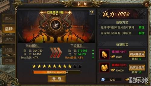 2、盾牌可大幅提升防御力、攻击力,盾牌碎片可通过回收装备、击杀BOSS等途径获得,提升盾牌可对BOSS伤害免疫。