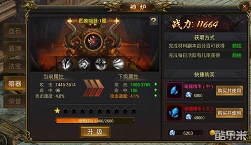 4、暗器可大幅提升攻击力、命中和攻速,消耗暗器碎片可以升级暗器获得更高属性,暗器碎片可通过材料副本、击杀BOSS获得。