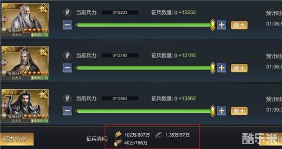 首先是没有名仕征兵满需要102万粮草。换上减少征兵消耗名仕之后只需49W。