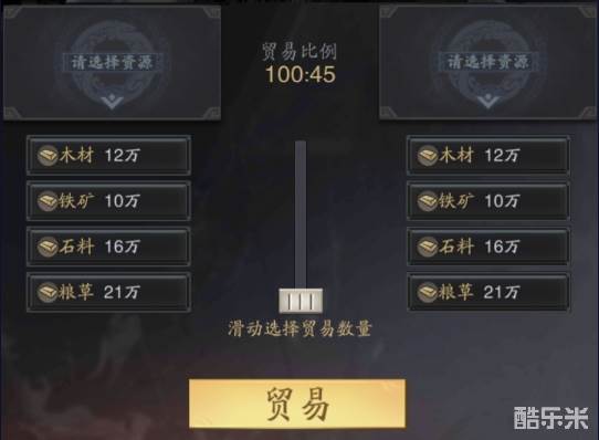 玩家可以在贸易系统内可以资源置换,四大资源木材、铁矿、石料、粮食之间可以按照一定比例进行交换,提升内政贸易等级和委任贸易使,可以提升交换比例。不过通过此种方式获得资源是血亏的,主公们还是需要合理生产和利用资源,只有在不得已的情况下才去使用此方法来弥补资源的不足哦。