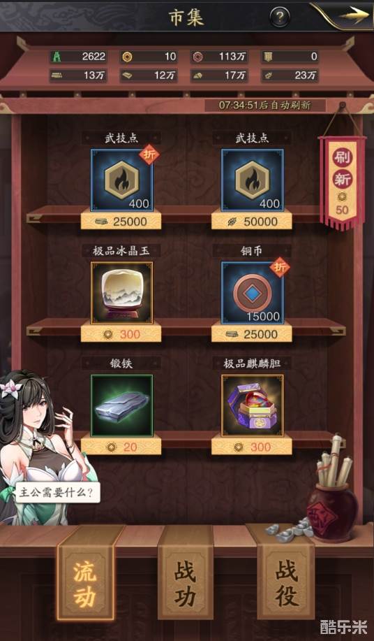 市集是玩家兑换物资的途径,可分为流动商店、战功商店、战役商店,其中完成霸业“天下大乱”可解锁流动商店和战功商店,完成主线任务第六章可以解锁战役商店。主公可以使用资源(木材、铁矿、石料、粮食)或金铢、战功兑换资源、锻造材料、武将进阶材料。商店还会刷出折扣商品,可以优先兑换这类性价比较高的物品哦~