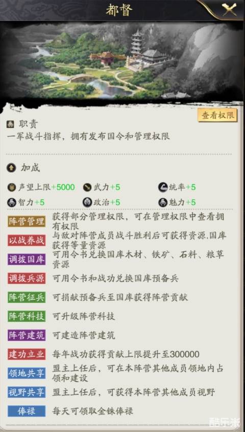 第二层为内阁,设置有军师、都督的角色。军师主要是负责协助盟主管理阵营事务,拥有任免权和管理权限。都督主要是战斗指挥的角色,拥有发布国令和管理权限。