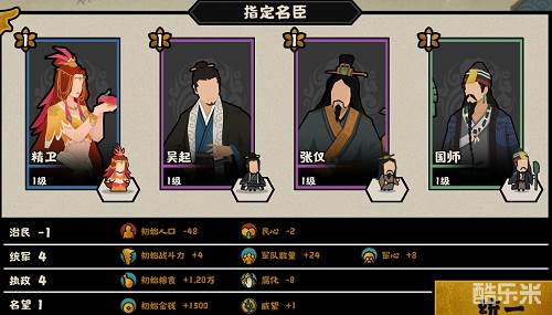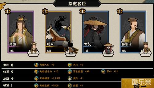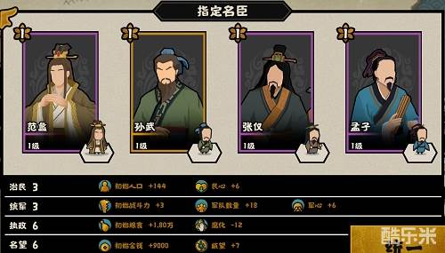 核心名臣张仪,张仪不仅能提高威望和他国好感度,还能提升用间;高威望和结盟可以为范蠡和孟子的施政提供条件,可获得更多的资源,然后配合孙武的用间,能轻松达成结盟、联盟。孟子可换成鬼谷子。