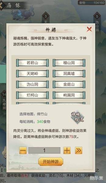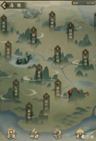 点击历练,在历练中会看到关卡地图,地图阶段都由编号罗列,直接点击挑战即可。地图中,每走一步都会消耗一定的食物储备,右上方可以看到消耗量,同时,地图中隐藏有各种资源和不同强弱的敌人,只要碰触便会触发,谨慎小心的走每一步是通关地图的关键所在。