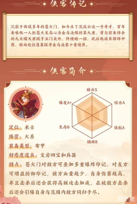 2、五火七禽扇:提高苍火门的第一波的伤害,使其印记伤害提升。