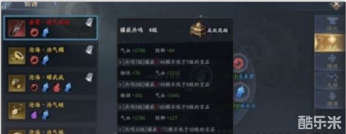 宝石镶嵌最需要注意的技巧,就是激活宝石的镶嵌共鸣属性。如图所示,当玩家身上的宝石达到共鸣要求时,能够激活镶嵌共鸣,给玩家带来大幅度的属性加成。因此不要盯着一颗宝石强化,结合自己的装备实力进行提升即可。