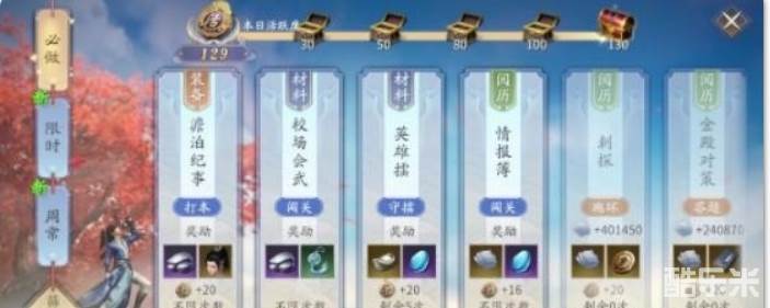 参与答题,无论对错都可以获得见识和阅历,答错了获得的见识减半;累积答对四次可以获得银子。每天答完五题之后,便不能再获得奖励。答题耗时短,奖励性价比极高,且具有一定趣味性,建议全部完成。