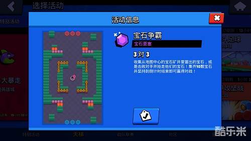 3、想必宝石争夺这个地图是在荒野乱斗中最常见的一个地图了,很多的玩家都对这个地图做了详细的研究,雅琪手相对较短,更适合在草丛多的地图作战,像这个地图的很适合,另外,宝石的生产处的地方在最中间,刚开始雅琪可以从两侧进发,队友在中间数出残血的对数,如果从两边出入,雅琪可以瞬间完成反杀,并抢夺宝石,如果最后局势不利,对方抢走了十颗以上的宝石,也可以用超级能将其拉回再夺回来宝石完成反击。