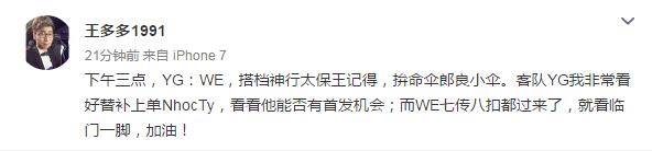 2017全球总决赛入围赛淘汰赛最后两个BO5今天已经打响,WE vs YG被安排在第二场。官方解说王多多微博称,将与记得、小伞一同解说今日WE的比赛。