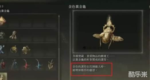 金色粪金龟护符效果介绍:佩戴后可以增加我们获取的卢恩数量,具体的数值大概为20%,跟黑魂中的贪婪金蛇戒指一个作用
