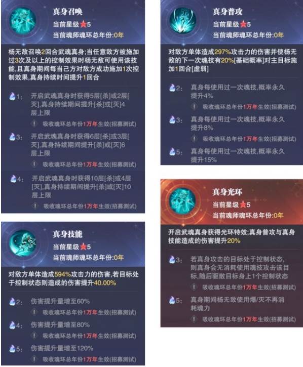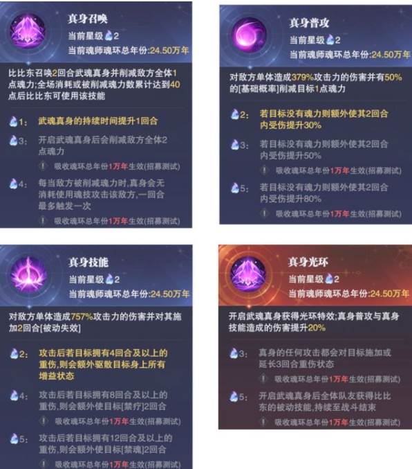 而每个武魂真身都有【真身召唤】、【真身普攻】、【真身技能】和【真身光环】四个效果,接着我们分别来看下3位魂师四大技能效果: