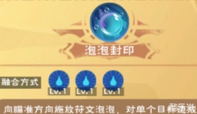 技能说明:向瞄准方向释放符文泡泡,对单个目标造成15(+60%符文魔法攻击+60%水符文强度)符文伤害,增加潮湿效果,并有40%概率禁锢目标3秒。技能强化:符文魔法攻击大于40时,禁锢概率提升至60%;符文魔法攻击大于50时,禁锢概率提升至80%,冷却时间25秒