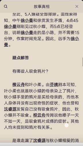 至此,5人嫌疑全部排除。柳云舟在4点45之前无人作证他去了哪里,且5点柳云舟出现在正厅,作案时间充足,出现在案发地点。结合芬姨和线索,柳云舟未喝下带迷魂散的枇杷膏却突然昏迷不醒,原因只能是吸入了鸦片,而吸食鸦片之后需要喝水,有接触到凶器的可能。因此凶手为柳云舟。