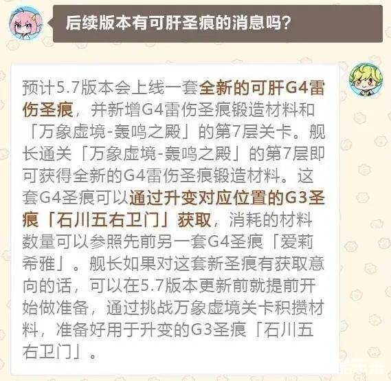 下版本的G4雷伤圣痕需要石川升变,如果已经有莫奈的话,那么可以这版本把她先升变成石川。如果没有,那么建议攒好材料,等下版本开放直接锻造方式时再锻造。不过,老玩家估计都歪好几套石川了(泪目)~