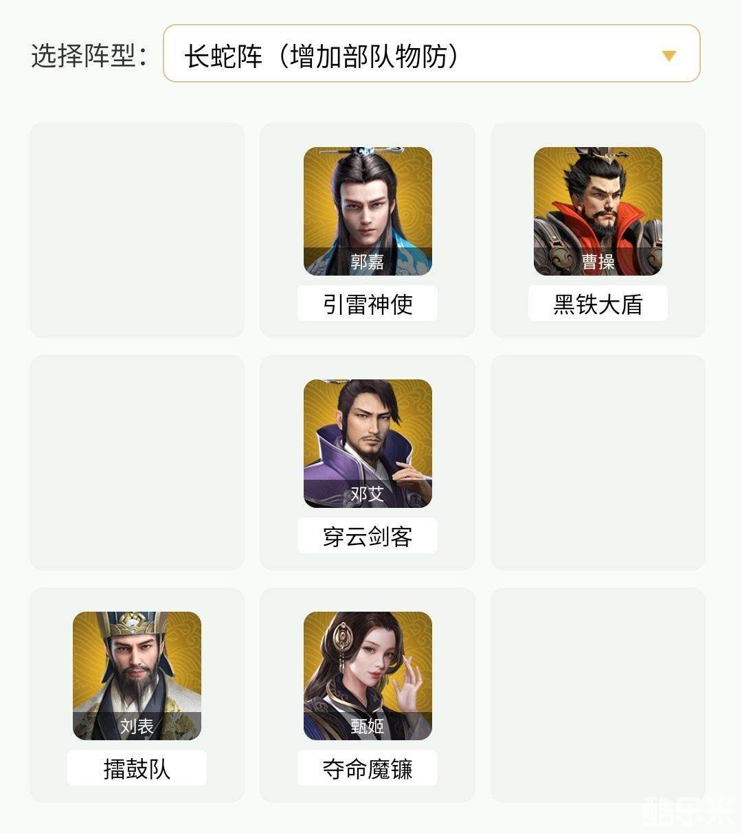 轮换武将推荐此阵容除了曹操,其他几位英雄都较好获得。郭嘉可由张角替代,甄姬可由蔡文姬替代,刘表可以由蒋琬替代。