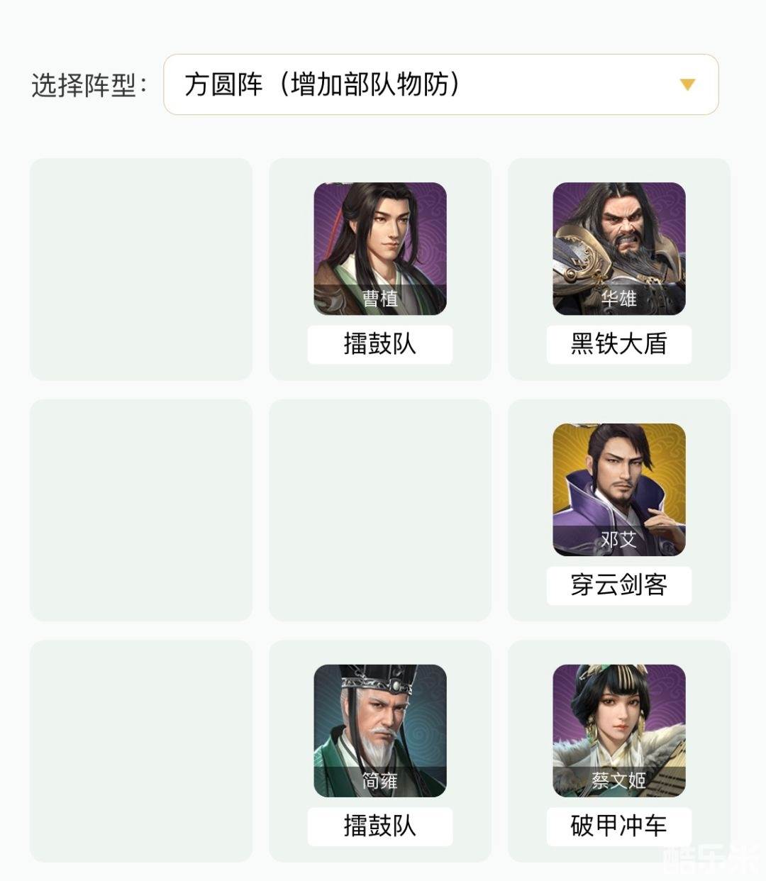 阵容解析邓艾作为主力输出,华雄有技能铁壁可作为主要肉盾,蔡文姬提高恢复能力,曹植和简雍为队伍提供士气,此阵容武将获取极为容易,可以很好的上手,获得了高级武将也可替换使用。