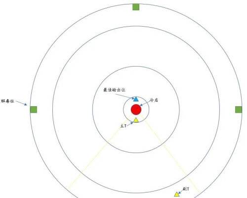 【天王站位】:两个天王充当主T和副T,进活动直接按上图站位,图示下方黄色虚线中间的区域,除了主T和副T,其余输出尽量不要进入。下方解毒柱为两个T专用,其余三个柱子为10人使用。