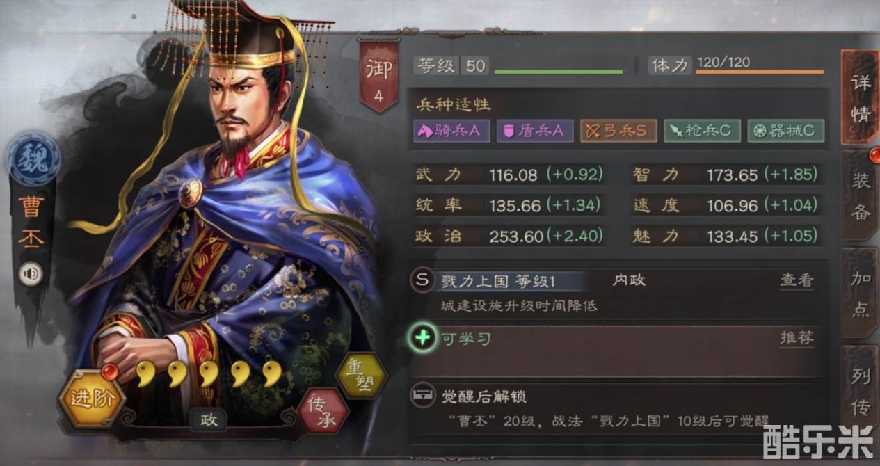 分析:曹丕的自带战法只有在委任为主政官时才会生效,能够减少大幅减少城建设施的升级时间,战法满级可以减少30%,也是游戏内唯一一个能够降低城建设升级施时间的武将。