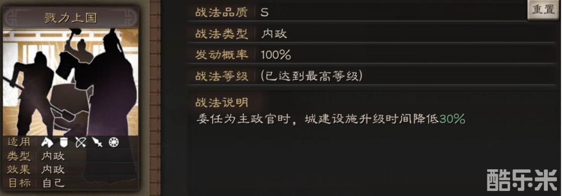 【内政战法】戳力上国:委任为主政官时,城建设施升级时间降低。