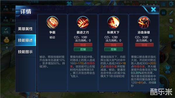 大招-浴血枭雄:曹操强化自身大剑,对附近敌人造成物理伤害,并大幅度提升自身的攻击力与韧性,在一定时间内,曹操的每次普攻或技能命中敌方时将回复自身生命值。