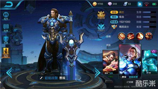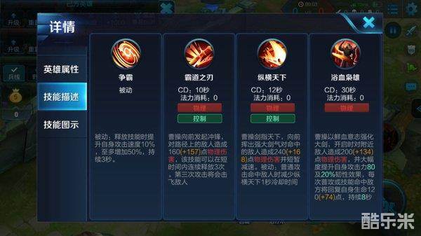 【浴血枭雄】:这个技能是曹操的核心技能,是一个全面增幅技能,所谓的鲜血枭雄,指的就是曹操的三技能,在三技能释放后,曹操的普攻和技能都能给曹操回复自身的血量,并且在技能时间内曹操大幅度增加自身的韧性和攻击力,能够切入敌方后排肆意输出。