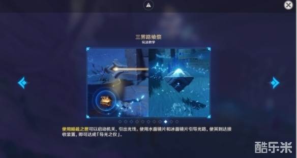 将图中左侧第一处水面镜片使用一次旋转,再将第二处水面镜片使用冰元素转化为冰面镜片。最后使用睦疏之匣,完成第一处导光之仪的解密。