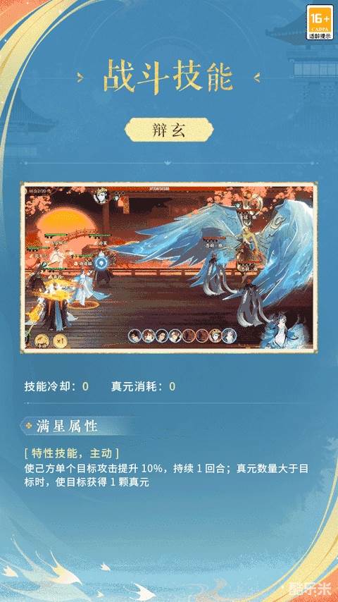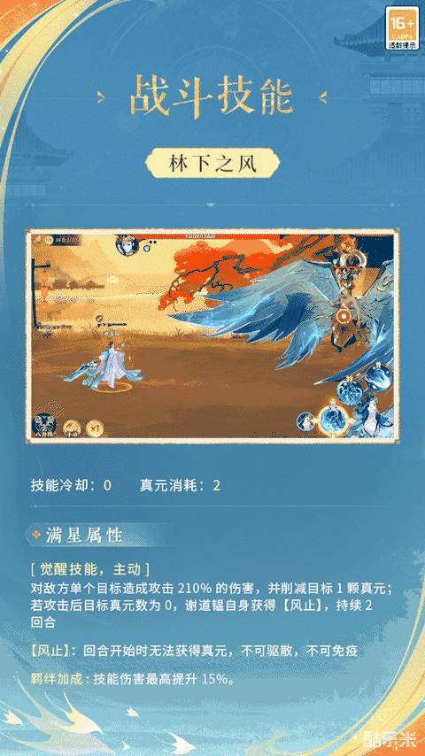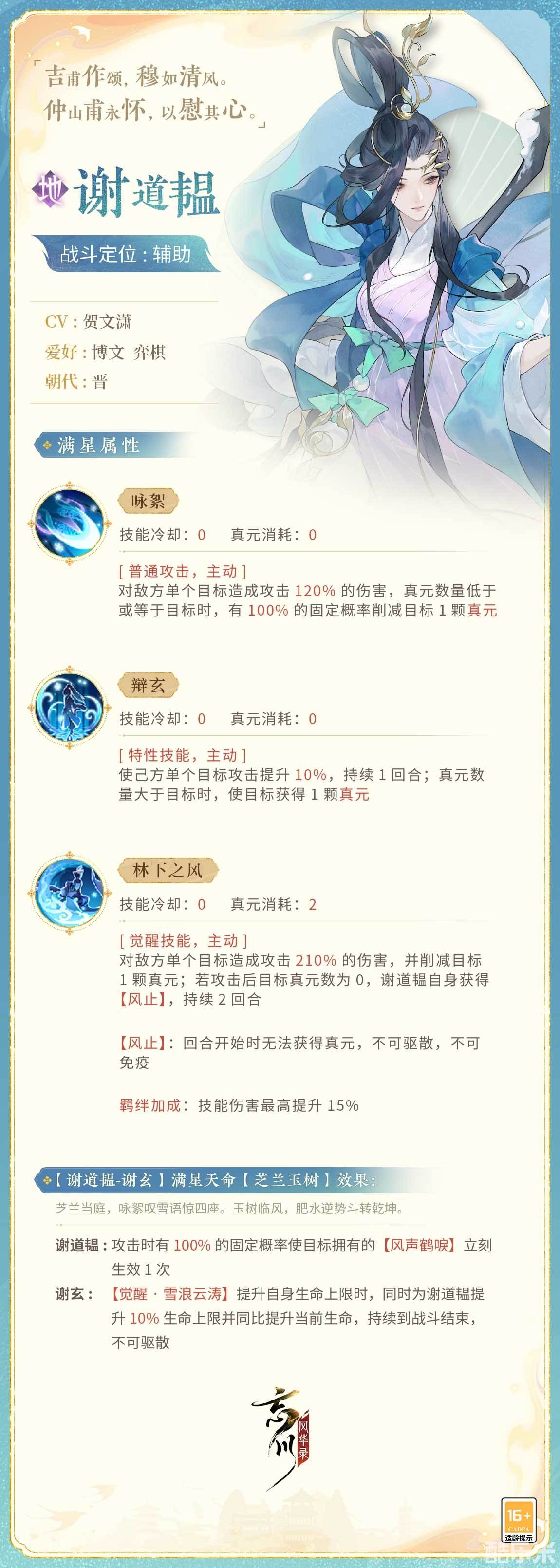 谢道韫在战斗中作为辅助出战!她以技能【咏絮】为普通攻击,【辩玄】为特性技能,【林下之风】为觉醒技能,触发羁绊时技能伤害最高提升15%,神情散朗,穆如清风!