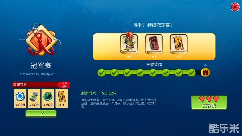 其中最有意思的玩法就是全新加入的“冠军赛”,在充满随机性的一场场比赛中体验刺激和爽快所带来的乐趣,只要在特定的渔场以三颗心的有限生命战胜同台对手、完成比赛就能逐步晋级,赢到最后夺得终极大奖!参与即是荣誉,全新冠军赛玩法不但具有每次胜利都能提升奖励档次的激励机制,还能在不断挑战对手、突破自我极限的同时收获满满的成就感!