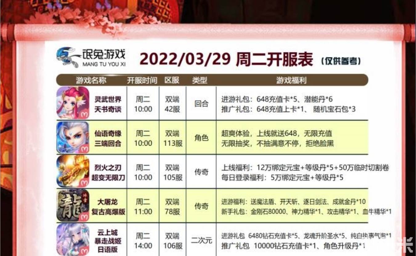 | 仙语奇缘-无限抽 | 天下113区( 苹果- 安卓) | 2022-03-29 10:00:00 |