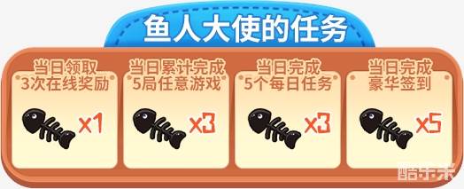 活动期间,每天完成“鱼人大使的任务”即可获得“鱼骨头”,根据累积获得的“鱼骨头”数量,领取特别奖励!