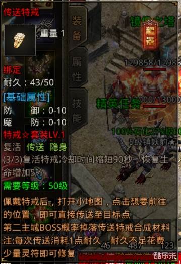 传送戒指:顾名思义,就是能让你瞬间传送到你想要去的地方,但极个别图除外,而且传送戒指具有耐久,没耐久了需要修理。传送特戒买赞助伞会送,买vip会送特戒碎片。传送特戒装备可以增加防御和魔防。