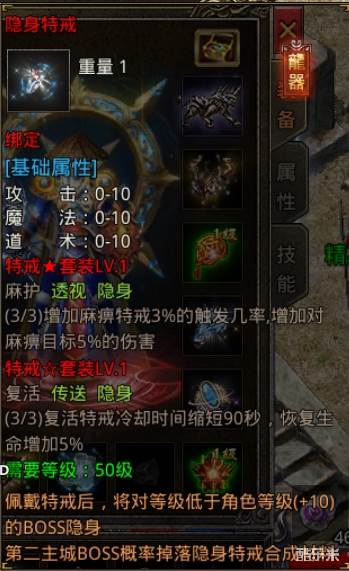 隐身戒指:能让你在怪物面前隐身,防止你被怪物群殴致死,有了隐身特戒就可以放心挂机了,但是隐身是有级数限制的,记得看清楚在挂机。隐身加的是攻击力,想要提升战力可以多搞碎片来升级。