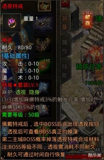 透视特戒:能让你提前知道这个怪物会爆出什么装备,打高级怪的时候可以先透视一下在决定打不打。透视是有次数限制的,根据怪物的等级来扣耐久,耐久一小时后自动回复。透视戒指加的是攻击力,也就是战力。