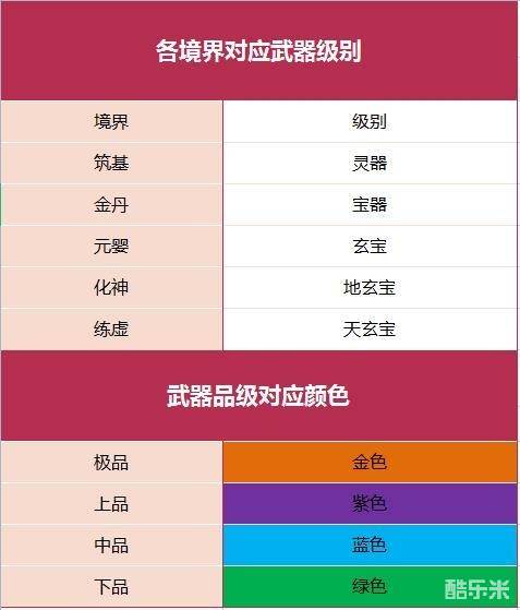 当然,武器也分品级,与等级境界,以下附上一目了然表,看了你就秒懂。