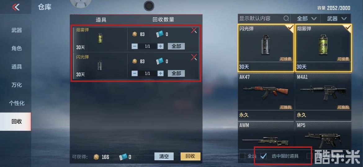 游戏中经常会送一些期限版的普通武器,在人手一把英雄武器的今天,期限武器唯一的价值就是回收成精通点。以前大家只能在仓库界面逐个回收,但现在我们可以直接点击右下角的“选中限时道具”进行一键回收。除了期限武器可以这样操作之外,期限的万化道具也支持一键回收哦!